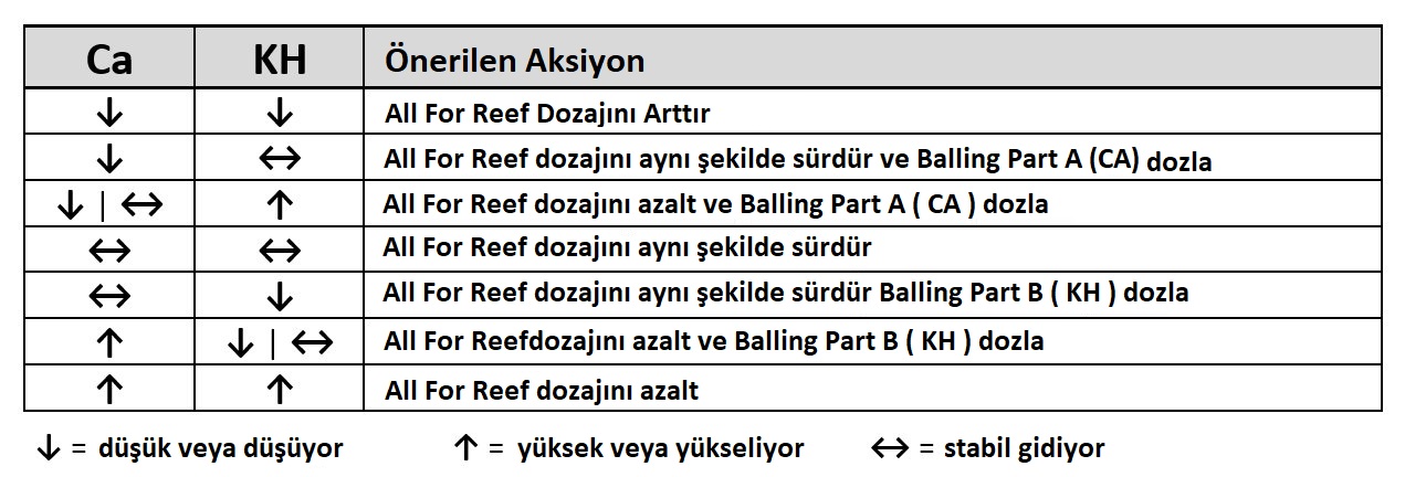 Başlangıç için her 100 litre akvaryum suyu başına günlük 5 ml All-For-Reef uygulayın. Karbonat sertliği ve kalsiyum seviyeleri stabilize olduktan sonra bu dozu her 100 litre için günde 2,5 ml artırabilirsiniz. Sistemin dengesi sağlandıktan sonra düzenli olarak kalsiyum ve karbonat sertliğini ölçerek gerekli doz ayarlamalarını yapabilirsiniz.